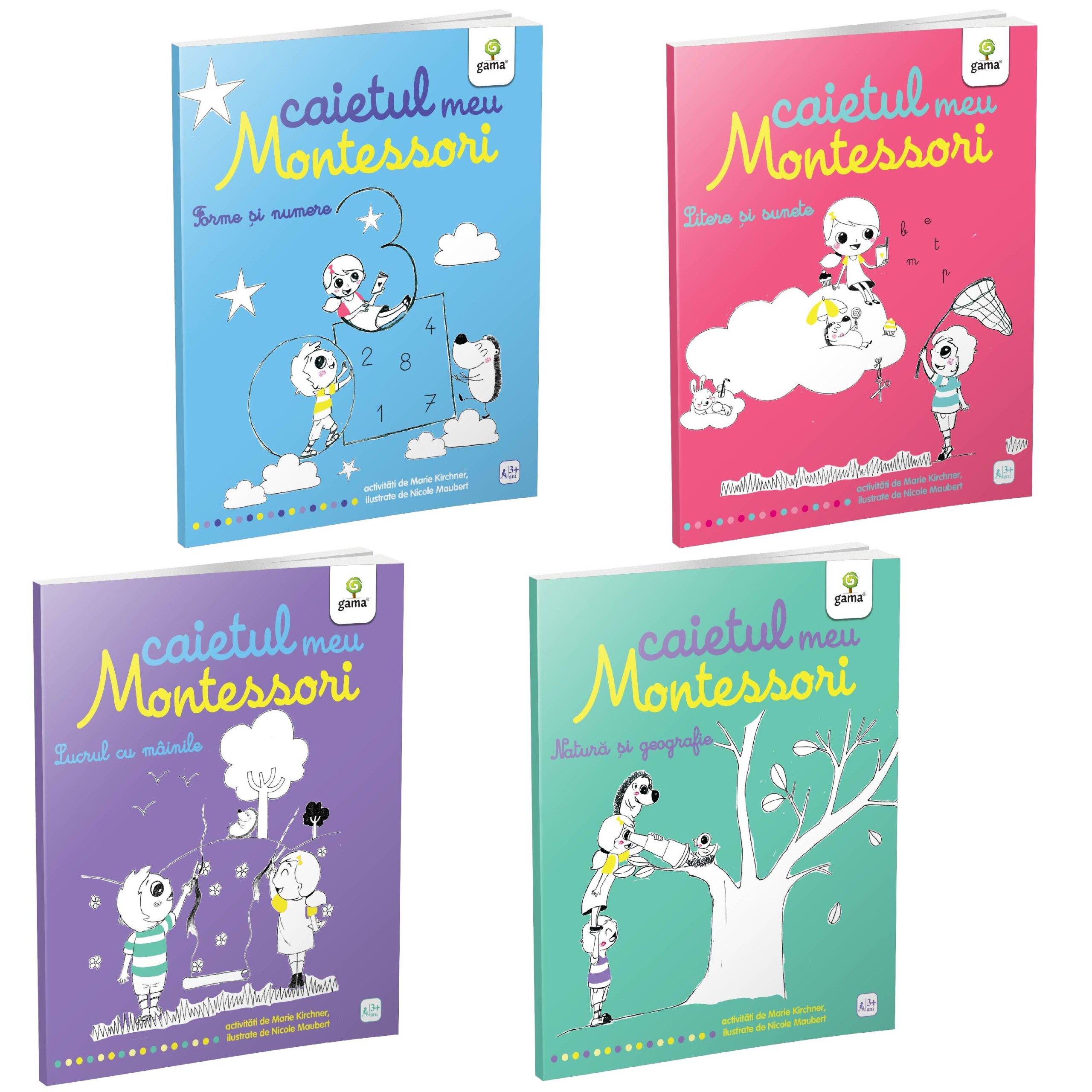 Cele patru caiete de lucru concepute de Marie Kirchner, directoarea unei şcoli Montessori din Paris, propun activităţi tactile şi vizuale ce încurajează copilul să lucreze singur şi să descopere, treptat, formele şi numerele, literele cursive şi sunetele, apoi scrierea. Sfaturile pentru părinţi, incluse la începutul fiecărui caiet, sunt utile pentru a înţelege cum trebuie încurajată şi favorizată dezvoltarea abilităţilor copilului.