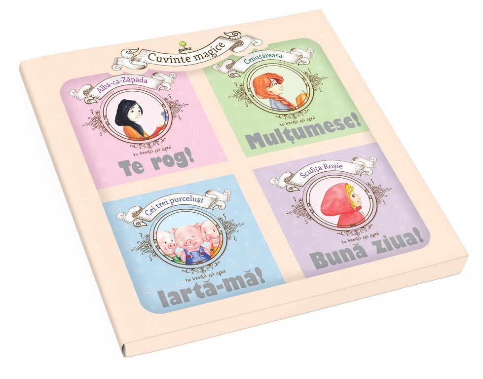 Cu ajutorul celor mai îndrăgite personaje din povești – Albă-ca-ZăpadaCei trei purcelușiCenușăreasa și Scufița Roșie –, el va învăța care sunt „cuvintele magice” și cum să le folosească puterea. Cutia elegantă, potrivită și pentru a fi oferită cadou, conține patru cărticele cartonate, cu colțuri rotunjite, potrivite chiar și pentru copiii mici.