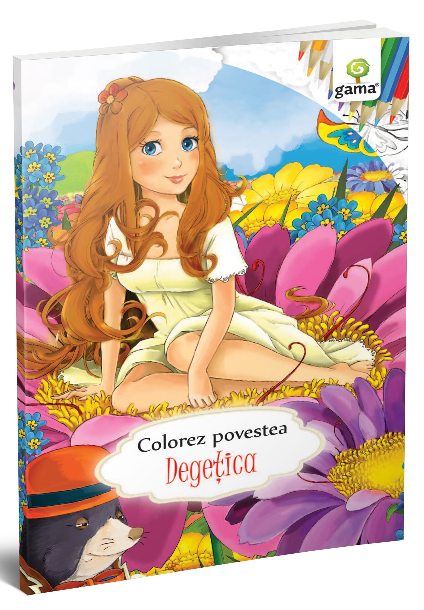 Peripețiile micuței Degețica se dezvăluie într-o nouă carte de colorat cu poveste. Fiecare pagină de colorat este însoțită de una identică, gata colorată, ce poate fi folosită drept model. Desenele sunt simple, cu linii clare și groase, pentru a ușura efortul de a respecta conturul.