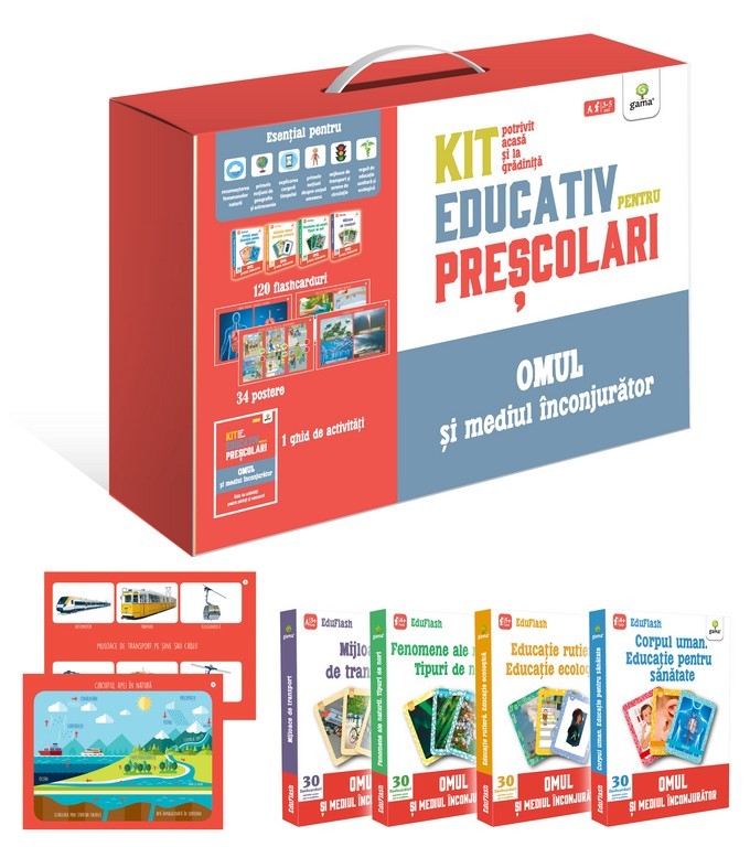Colecția EDUKIT, special dedicată dezvoltării preșcolarilor, a apărut din nevoia de a oferi părinților, dar și cadrelor didactice resurse educaționale utile, educative, relevante, riguros documentate și bine ilustrate, care să slujească drept instrumente pentru nenumărate activități. Fiecare gentuță conține flashcarduri, postere și o carte de prezentare, cu sugestii de activități care se pot face în timpul liber, deopotrivă acasă și la grădiniță.