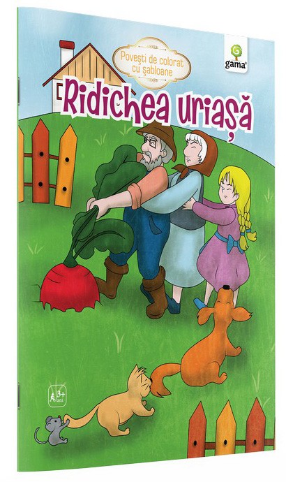 Cartea de colorat „Ridichea uriașă” se poate folosi în trei activități diferite: mai întâi citiți povestea, apoi colorați scenele preferate, iar la final folosiți șablonul inclus pentru a recrea o scenă de basm. Șablonul este detașabil, așa încât desenul preferat se poate reface oricând!