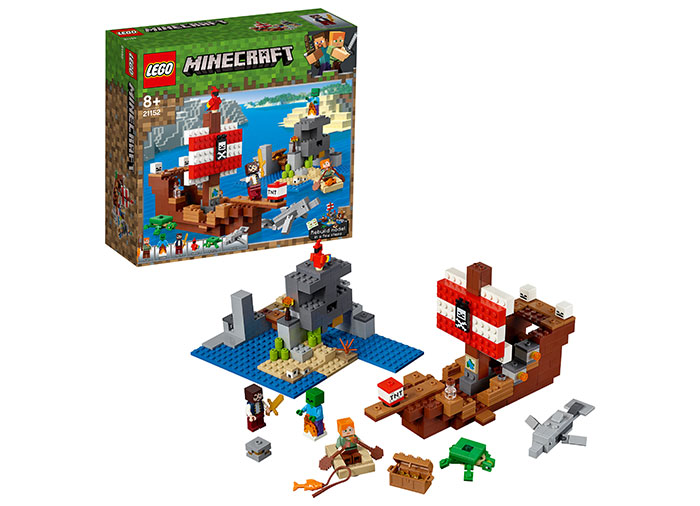 Ahoi prieteni! Uita-te la noul tau skin grozav de pirati Minecraft si porneste cu Alex in aventuri palpitante cu pirati, pe o insula Minecraft a craniilor. Construieste o nava de pirati teribila cu detalii de aur, steag de pirati, pasarela, tunuri si chiar si un papagal simpatic! Incarca tunurile navei si protejeaza broasca testoasa si ouale ei impotriva zombilor hoinari. Apoi apuca harta si busola, si sari in barca cu vasle pentru a pescui, sau poate delfinul prietenos te conduce spre o comoara ascunsa? Iar cand simti nevoia de o schimbare, rearanjeaza pur si simplu acest set modular pentru a crea o impresionanta baza de pirati tropicala!