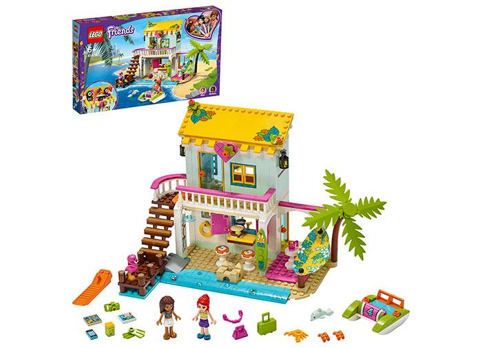 Este timpul sa te destinzi si sa te relaxezi la Casa de pe plaja LEGO Friends. Vino cu Mia si Andrea intr-o escapada estivala super tare. Sari de pe debarcader pe hidrobicicleta Miei. Pedaleaza inapoi spre plaja si asteapt-o pe Andrea sa te serveasca cu o gustare. Exploreaza dormitorul super al fetelor, unde poti descoperi o harta veche a unei comori. Iar cand apune soarele, acoperisul se ridica pentru a dezvalui cabina de DJ a Andreei.
