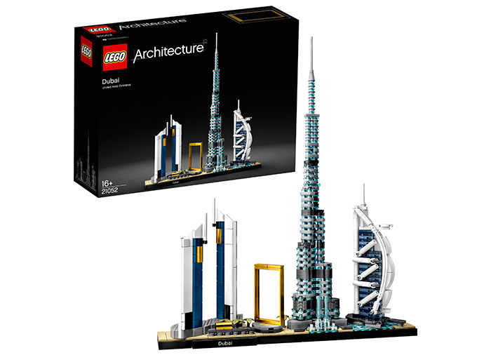Acest set de construc?ie pentru adul?i include modele la scara ale urmatoarelor cladiri: Buji Khalifa, cea mai înalta cladire din lume, hotelul de 7 stele Burj Al Arab Jumeirah, hotelul Jumeirah Emirates Towers, plus Fântâna Dubai ?i extraordinara Dubai Frame. Împreuna cu placa de baza cu o placu?a cu nume, aceste cladiri creeaza o piesa de impact, ideala pentru a fi expusa acasa sau la birou.