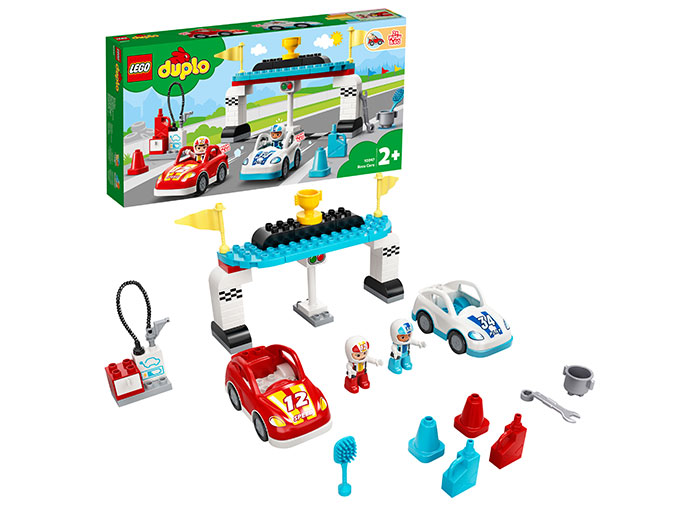 LEGO� DUPLO� Town (10947) Ma?ini de curse sunt un set de joc de curse colorat ?i plin de distrac?ie cu joc pe roluri ?i beneficii de dezvoltare pentru micii pilo?i.