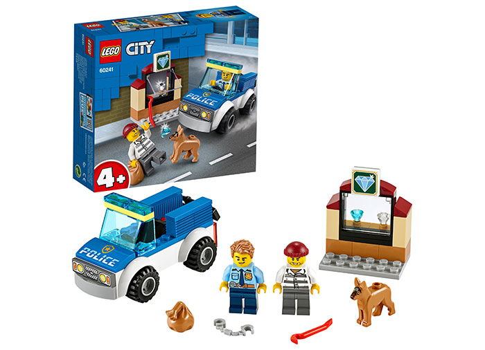 Vai, nu! Un escroc incearca sa sparga magazinul de bijuterii si sa fure pietrele pretioase. Cu asta se ocupa Unitatea de politie canina LEGO City! Sari la volanul puternicei masini de politie si goneste la fata locului. Apoi da drumul devotatului caine politist si aresteaza escrocul inainte de a putea fugi! Inca o zi plina de succes pentru eroii din LEGO City.